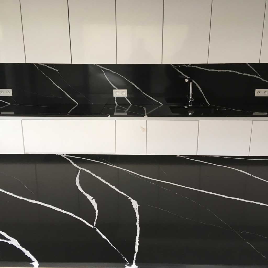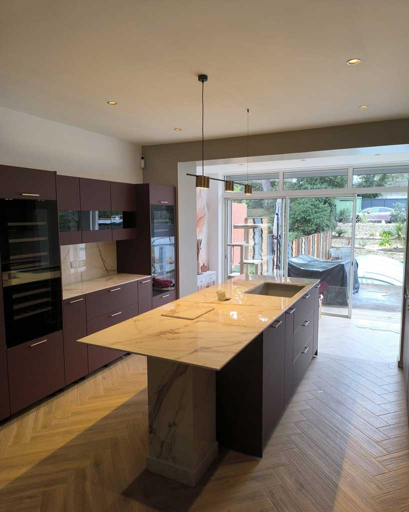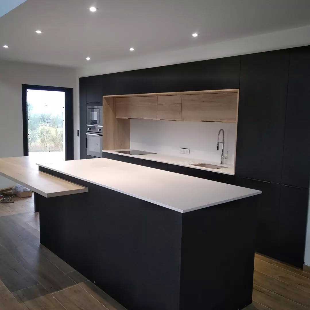 Grâce à la découpe numérique et aux finitions manuelles, chaque pièce est ajustée au millimètre : évier encastré, plaques de cuisson, joints, retombées, angles et assemblages invisibles.
