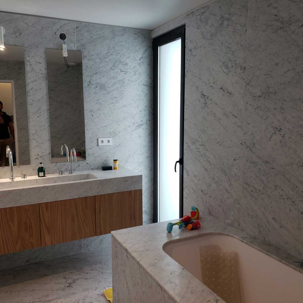 La céramique et les pierres naturelles sont parfaitement adaptées aux pièces humides. Les habillages de salle de bain remplacent avantageusement le carrelage traditionnel grâce à leurs grandes dimensions et à leurs joints limités.