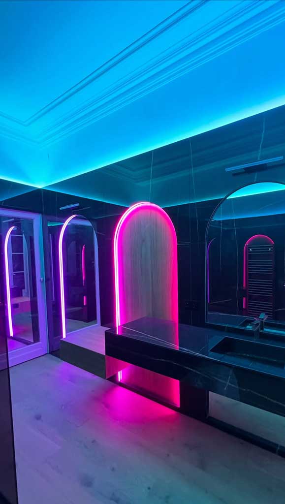 Crédences, parois, plans vasques, retombées : chaque élément est fabriqué sur mesure pour s’intégrer sans rupture visuelle.